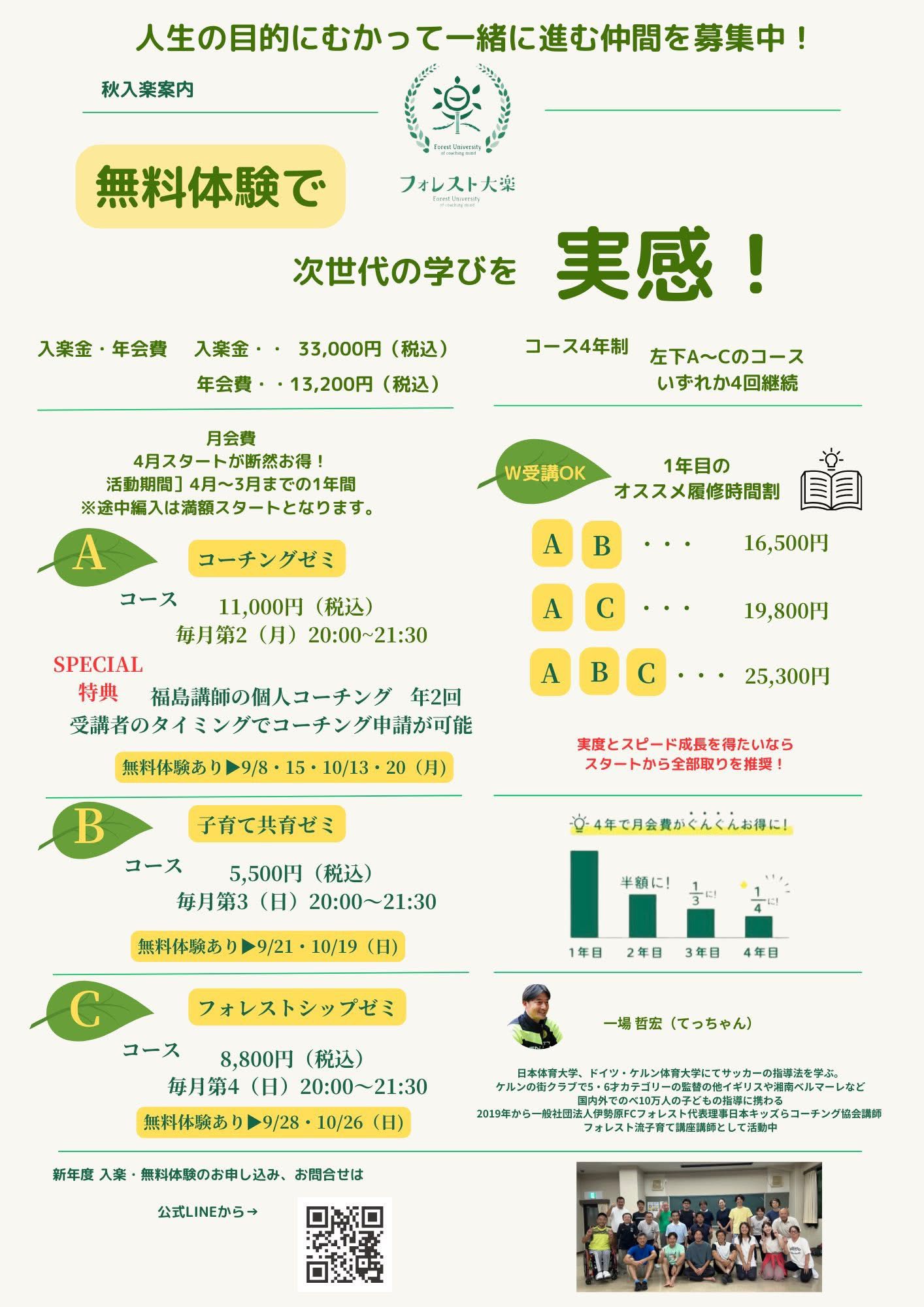 春と秋に開催しているオープンキャンパスのときに体験して頂けます。ご案内はLINEで送りますので、まずはフォレスト大楽のLINEに登録しておいてください。
