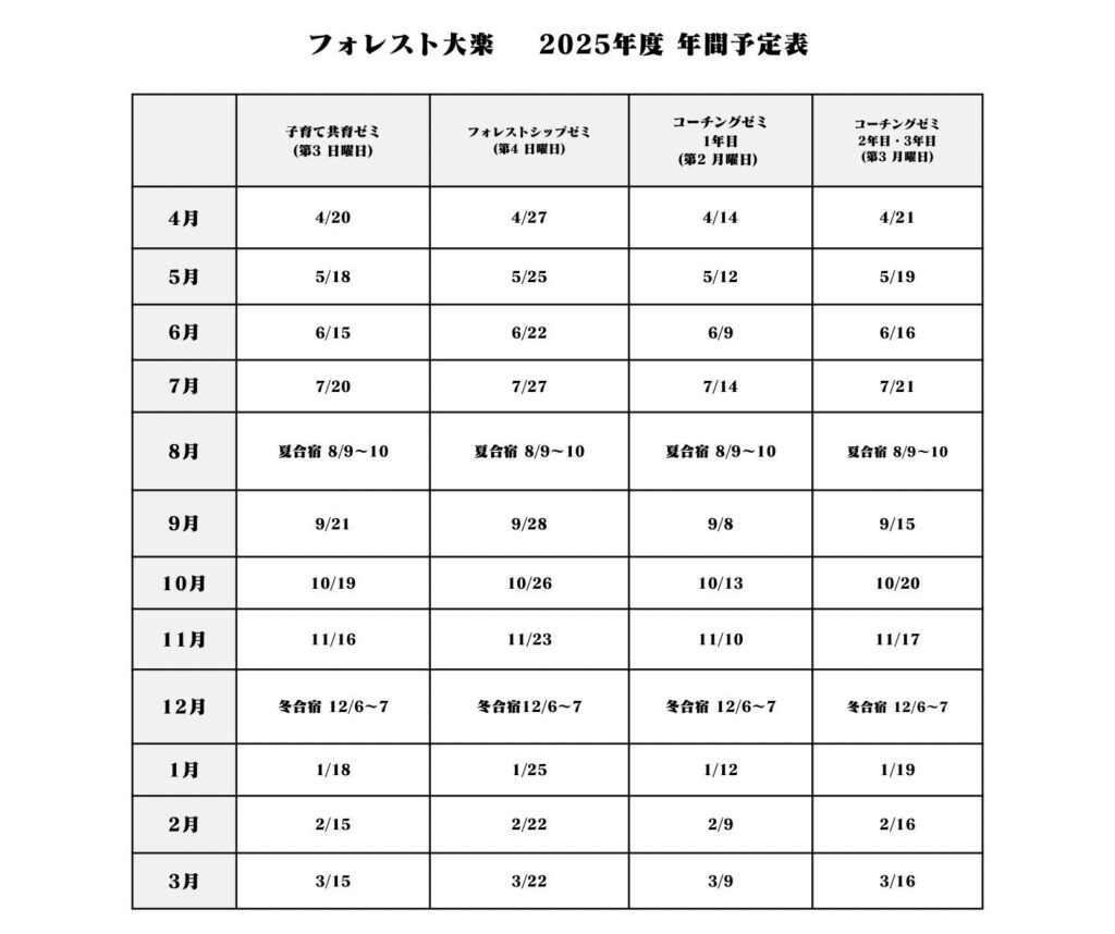 フォレスト大楽の各学科は以下のスケジュールで月に1回の授業があります。